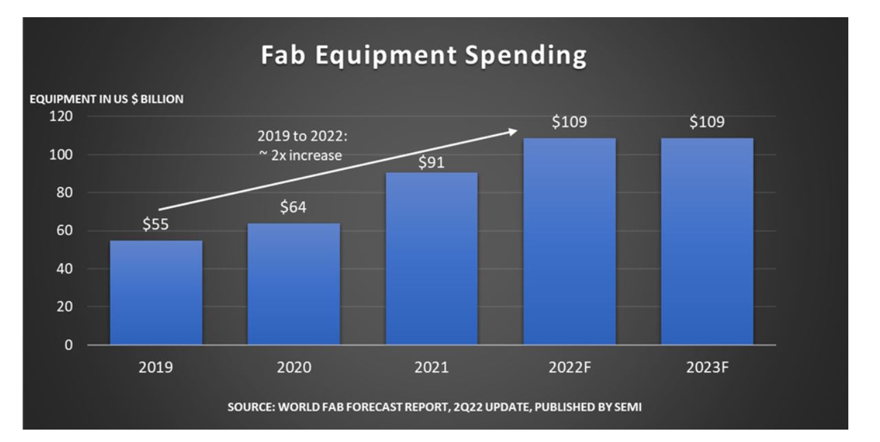 Selon l’association Semi, les dépenses mondiales d’équipement de production de puces devraient connaître une augmentation annuelle de 20% pour atteindre 109Md$ en 2022, marquant ainsi la troisième année consécutive de hausse. Rappelons qu’en 2021, les dépenses avaient bondi de 42%. Selon les prévisions de Semi, le montant des dépenses en 2023 devrait rester le même que cette année.