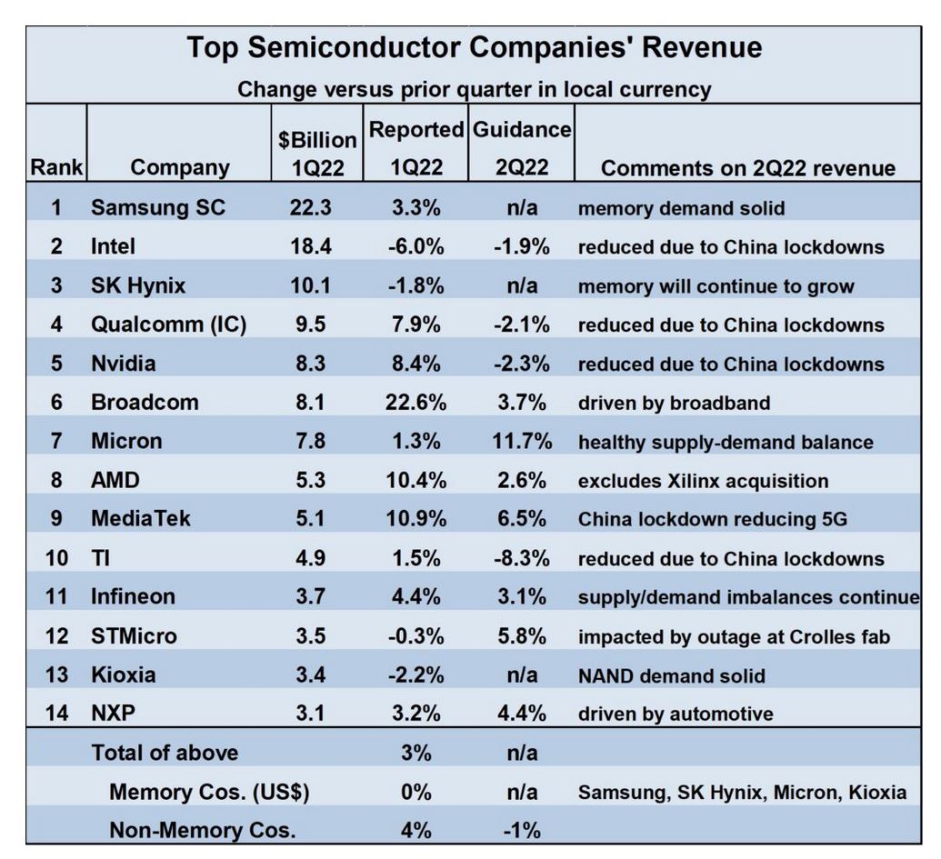 Quatre des quatorze principales entreprises de composants électroniques prévoient une baisse de revenus au 2e trimestre 2022 par rapport au 1er trimestre 2022 : Intel (-1,9%), Qualcomm (-2,1%), Nvidia (-2,3%) et TI (-8,3%).