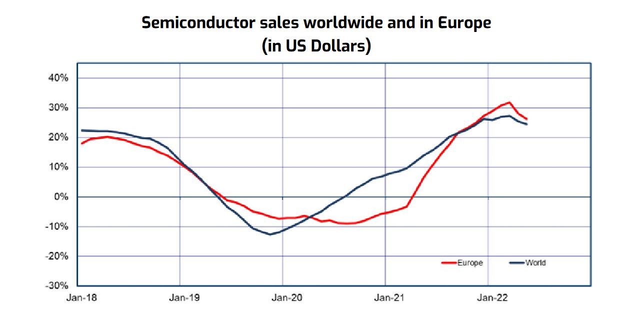 Les ventes européennes de puces au cours des cinq premiers mois de l’année 2022 ont augmenté de 20,4% par rapport à la même période en 2021. Elles ont affiché 4,44Md$ en mai, selon l’association européenne de l’industrie des semi-conducteurs (ESIA).