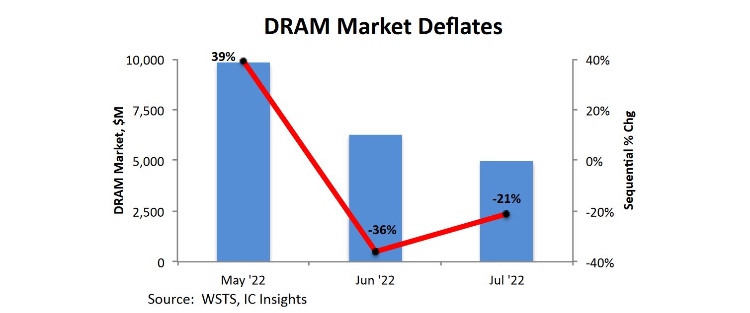 Le ralentissement cyclique des ventes de puces n’est plus un secret et il a débuté par la chute du marché des Dram. Plus précisément au mois de juin. Plusieurs facteurs ont mené à cette situation : d’un côté, les fabricants doivent écouler leurs stocks, de l’autre, les consommateurs achètent moins de smartphones, téléviseurs et ordinateurs à cause de l’inflation qui monte en flèche.
