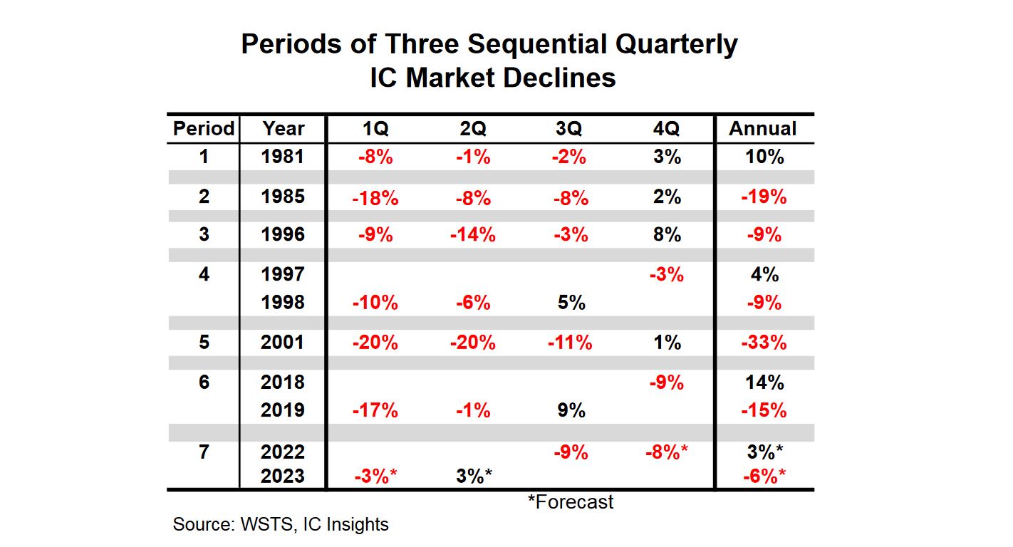 IC Insights rappelle que la dernière fois que le secteur a connu une baisse des ventes sur trois trimestres consécutifs remonte à la période comprise entre le 4e trimestre 2018 et le 2e trimestre 2019.
