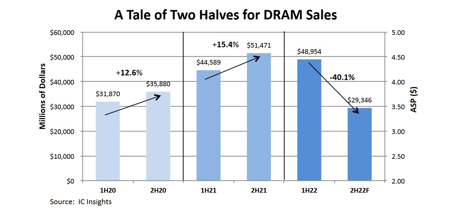 La deuxième moitié de l’année est généralement la période où les ventes de Dram augmentent en vue de nouveaux produits lancés pour les fêtes de fin d’année. Or cette année, ce n’est pas le cas. Au contraire, les ventes de Dram devraient chuter de 40,1% au 2nd semestre 2022 par rapport au 1er semestre, selon le cabinet d’études IC Insights. Elles atteindraient 29,3Md$ contre pratiquement 49Md$ au 1er semestre 2022.