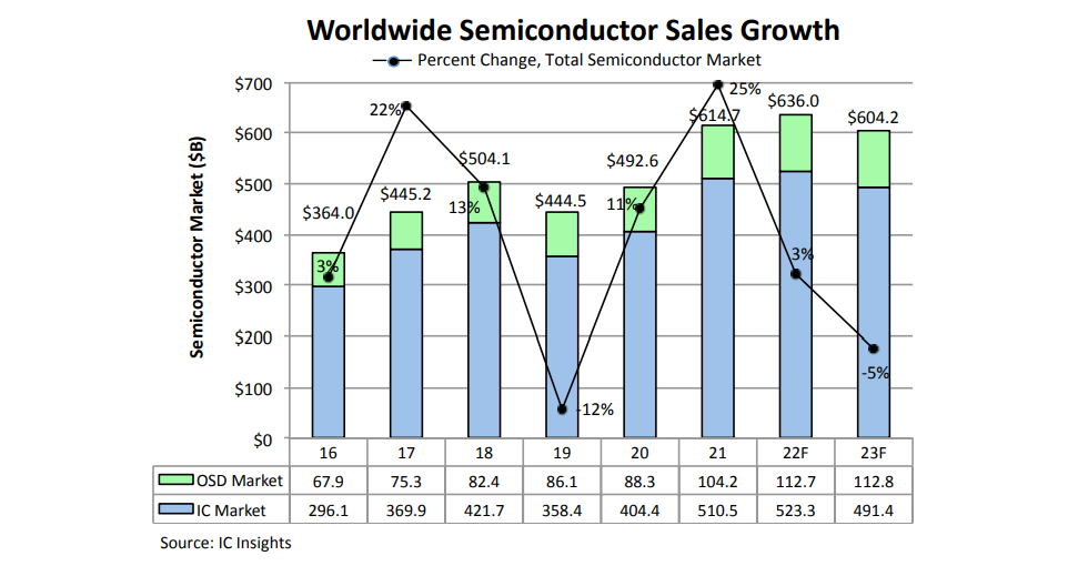 L’heure est au bilan et aux prévisions. Cette fois-ci, c’est au tour du cabinet d’études IC Insights de livrer ses prédictions 2023. Il semblerait que la chute des prix des mémoires et l’incertitude qui pèse sur l’économie mondiale entrainent une baisse des ventes des semi-conducteurs l’année prochaine. Si celles-ci affichent 636Md$ avec une croissance de 3% cette année, en 2023 elles devraient chuter de 5% pour atteindre 604,2Md$.