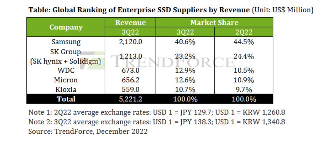 Samsung, leader des SSD, voit sa part de marché tomber à 40,6% au 3e trimestre 2022 contre 44,5% au 2e trimestre 2022.