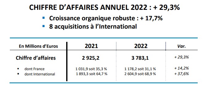 Pour sa part, la croissance externe 2022 a été marquée par le rachat de huit sociétés à l’international : en Europe (Allemagne, Espagne, Royaume-Uni et Roumanie), en Inde, aux Etats-Unis et en Australie. L’addition de leurs chiffres d’affaires et de leurs effectifs additionnés atteint 189M€ et 2130 personnes. A contrario, la société a cédé une activité « non stratégique » fin décembre 2022 : il s’agissait du pôle spécialisé dans le consulting Agile présent aux Etats-Unis et au Royaume-Uni, pesant 147,1M€ de chiffre d’affaires, et totalisant 550 consultants salariés.