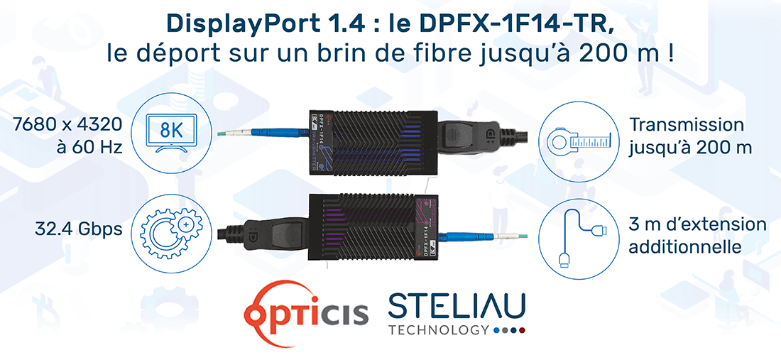 Opticis, partenaire de Steliau Technology, lance son nouveau produit, le DPFX-1F14-TR, conçu pour déporter un signal vidéo Display Port 1.4 jusqu’à 200 mètres sur un seul brin de fibre optique multimode et offrant un débit de 32.4 Gbps, permettant une résolution maximale de 8K DSC (7680×4320) à 60Hz !