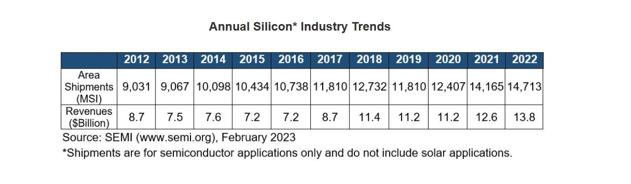En 2022, les revenus générés par les ventes mondiales de tranches de silicium s’élèvent à 13,8Md$, en hausse de 9,5% par rapport à 2021.