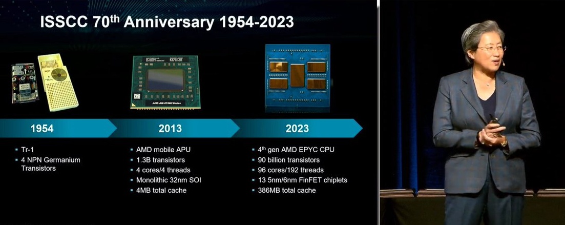 Another method of making better use of memory and limiting data round trips is processing in memory (PIM), a technique that is “a bit counter-intuitive for us processor manufacturers“, says the AMD CEO with a smile, but which is the subject of a great deal of research and which was also the subject of a separate presentations category at ISSCC 2023. Another priority for the future : processors and complex circuits will have to be equipped with integrated optical interfaces so that the energy efficiency efforts undertaken inside the package are not wasted by the increased consumption linked to the transport of this data. Lisa Su is also betting on the advent of standardised interfaces in this area, for example around the CXL protocol, and cites the presentation by an AMD team of an optical WDM link consuming a total of 2.5 pJ/bit and made by stacking 7 nm Cmos and 45 nm optical chips.