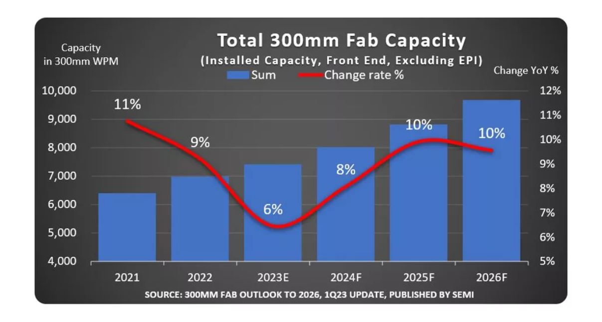 Tandis que l’expansion de capacité de production sur tranches de 300mm devrait ralentir cette année à cause de la faible demande de mémoires et de dispositifs logiques, elle attendra en revanche des records en 2026. Selon l’organisation professionnelle Semi, 9,6 millions de tranches de 300mm seront produites par mois dans trois ans.