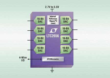 Ce convertisseur numérique-analogique 16 bits à 8 canaux présente une non-linéarité intégrale (INL) de ± 4 dB et intègre une référence de tension précise à 2 ppm/°C.