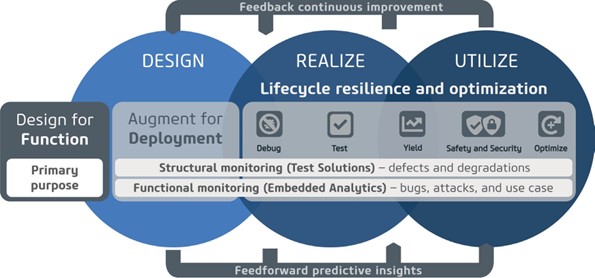 Figure 1 : Les solutions de gestion du cycle de vie du silicium englobent le cycle complet qui s’étend de la conception à la réalisation et à l’utilisation, en incluant le débogage, les tests, la gestion du rendement, la sûreté et la sécurité, ainsi que l’optimisation sur le terrain.
