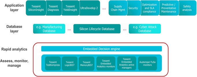 Situées au début du processus, les sources de données intégrées à la puce comprennent la logique DFT, les moniteurs paramétriques et les moniteurs fonctionnels. Les capteurs, les moniteurs et la logique DFT peuvent produire des quantités de données énormes, capables de submerger les meilleurs outils d’analyse. Une infrastructure de surveillance haut de gamme tient compte de ce risque en utilisant des moniteurs configurables au moment de l’exécution afin de ne collecter que les données pertinentes, en intégrant une technologie de compression des données et en disposant d’une connectivité externe rapide pour transférer les données hors de la puce.