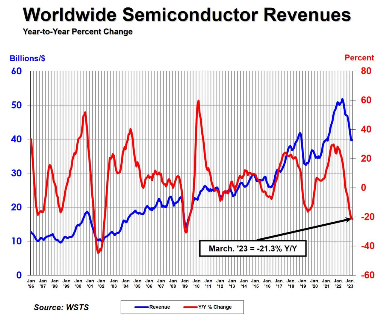 Alors que le secteur fait face depuis plusieurs mois à une baisse des revenus, le mois de mars marque une très légère hausse des ventes de puces au niveau mondial. Celles-ci ont augmenté de 0,3% par rapport à février 2023 pour atteindre 39,83Md$.