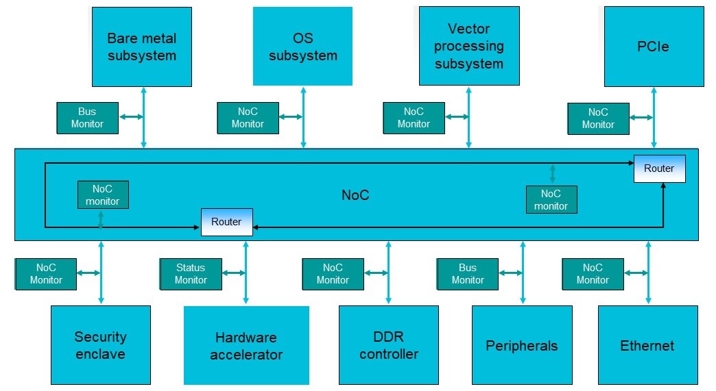 Une infrastructure à base d’IP, de logiciels de surveillance et d’analyse intégrée sur la puce offre tous ces avantages, de la simulation au déploiement. La figure 3 illustre une architecture typique de surveillance et d’analyse fonctionnelle d’un SoC.