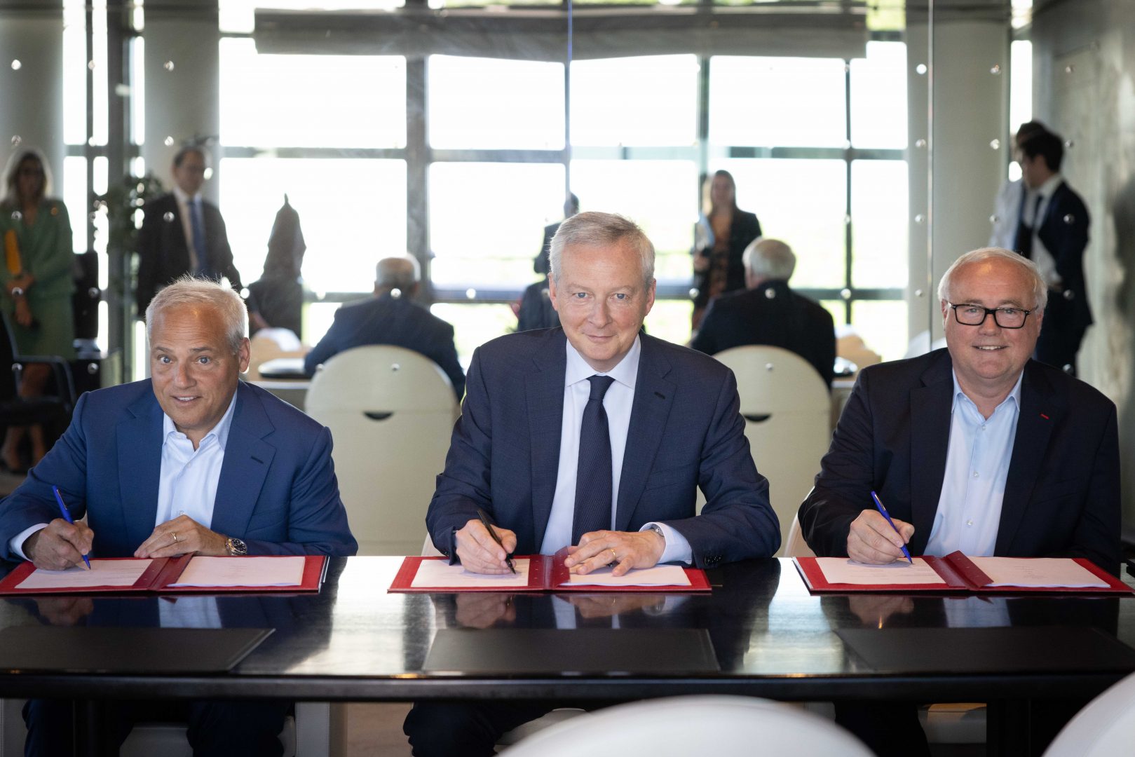 Bruno Le Maire, Jean-Marc Chéry et Tom Caulfield concrétisent le projet de la nouvelle usine de puces à Crolles