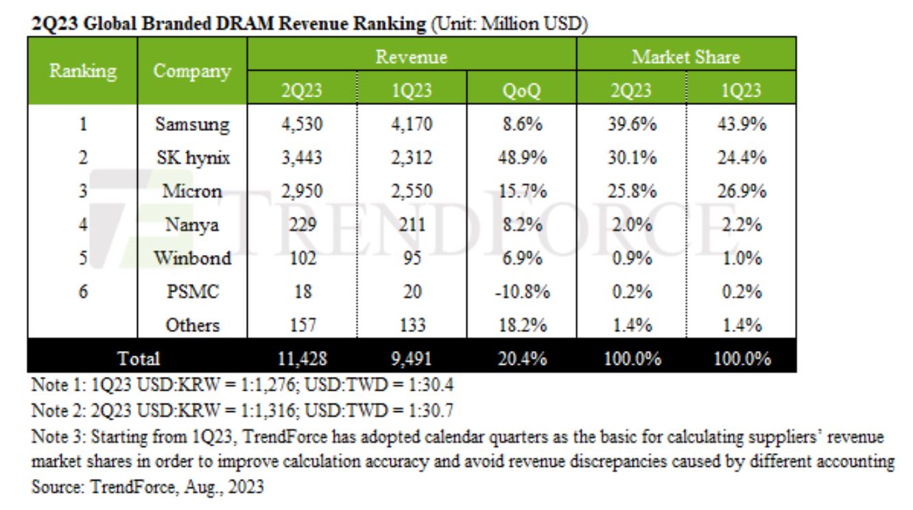 Parmi les fournisseurs de Dram, SK hynix enregistre la plus forte croissance trimestrielle avec +48,9%. Toutefois, Samsung conserve sa place de leader avec un CA de 4,53Md$ au 2e trimestre 2023. Micron, ayant pris un peu de retard dans le développement de la technologie HBM, occupe la troisième place avec un CA de 2,95Md$, en hausse de 15,7% par rapport au trimestre précédent.