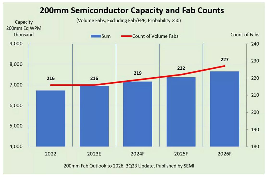 La capacité de production mondiale de tranches de 200mm devrait augmenter de 14% entre 2023 et 2026 pour atteindre un volume de 7,7 millions de tranches par mois, indique l’association professionnelle Semi.