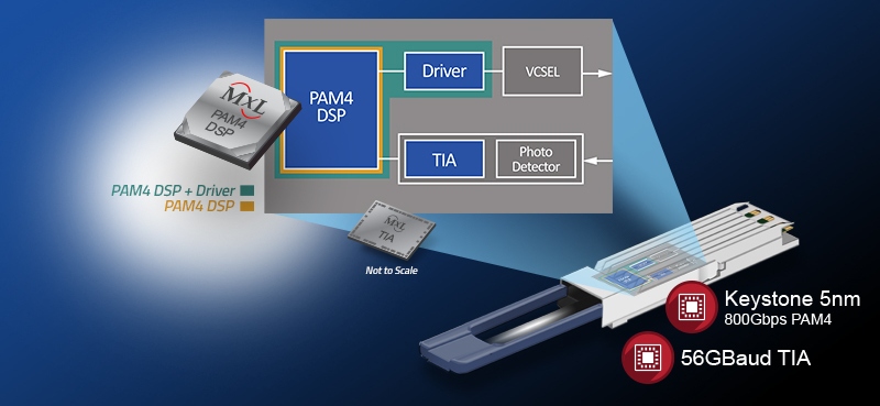 « L’explosion du déploiement des clusters d’intelligence artificielle créé une forte demande de liaisons optiques actives et de transmetteurs multimodes pour des interconnexion 400 et 800 Gbit/s à 100 Gbit/s par ligne », constate Drew Guckenberger, vice-président chargé des interconnexions haut débit chez MaxLinear. Les liaisons par fibre multimode constituent en effet un moyen économique de relier des équipements informatiques sur une courte portée. Pour ces applications, MaxLinear vient d’étendre sa famille de DSP PAM4 fabriqués en process 5nm en lançant le MxL93684 (nom de code : KeystoneMM). Son atout : il intègre également les pilotes de diodes VCSEL. Cela occasionne une réduction de l’encombrement sur la carte, mais aussi de la consommation. Grâce à ce circuit, le Californien évoque désormais des transmetteurs optiques 800Gbit/s nécessitant moins de 10W, alors qu’il évoquait plutôt 1 W lors du lancement de ses premiers DSP Keystone il y a deux ans. En cours d’échantillonnage, le MxL93684 sera disponible en volume au premier trimestre 2024.