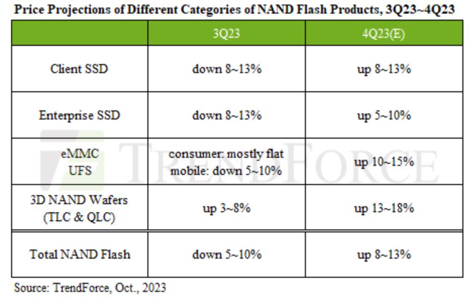 Selon le cabinet d’études TrendForce, les prix de la flash Nand au 4e trimestre 2023 devraient connaître une augmentation significative de 8 à 13%. Cette hausse est à attribuer principalement à la réduction de production de ces mémoires.