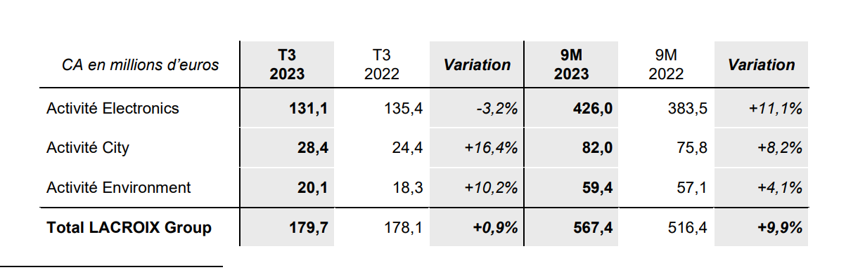En dévoilant ses résultats financiers pour le troisième trimestre 2023, Lacroix l’a placé sous le signe d’un « effet de base défavorable ». Progressant de 0,9% par rapport à la même période de 2022, le chiffre d’affaires de 179,7 millions d’euros, a été principalement porté par les activités City (+16,4% à 28,4M€) et Environment (+10,2% à 20,1M€). Les neufs premiers mois de l’année font apparaître un chiffre d’affaires en hausse soutenue de 9,9%, qui atteint 567,4 M€.