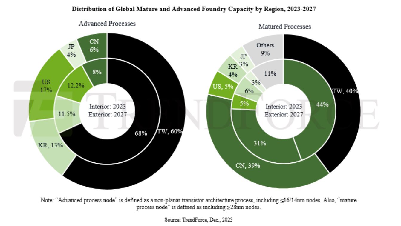 Selon la dernière étude du cabinet TrendForce, Taïwan reste en tête de la fabrication de puces avec des nœuds avancés (y compris les technologies 16 et 14nm). En 2023, l’île détient en effet 68% de la capacité de production mondiale dans ces technologies avancées. Le pays est suivi par les États-Unis (12%), la Corée du sud (11%) et la Chine (8%). Grâce aux incitations gouvernementales, l’étude estime que la Corée du Sud, les États-Unis et le Japon devraient gagner en capacité de production de composants avancés en 2027 et viendraient grignoter les parts de Taïwan sur ce terrain-là.