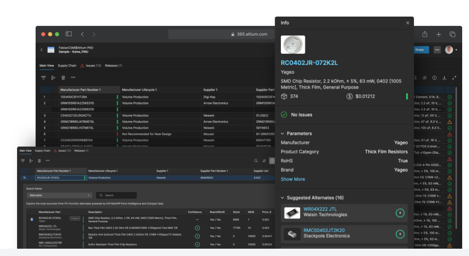 Selon Altium, les professionnels des achats possèdent désormais une visibilité sur les prochaines conceptions, et ce avant leur publication, leur permettant de déceler les problèmes dès l’amorce du développement. Les équipes d’approvisionnement et d’ingénierie bénéficient d’un tableau de bord complet qui surveille toutes les nomenclatures (BOM) en production, et fournit un aperçu immédiat de tout problème d’approvisionnement en pièces, en dépit des fluctuations des disponibilités des composants (sans compter leur obsolescence) et du marché.