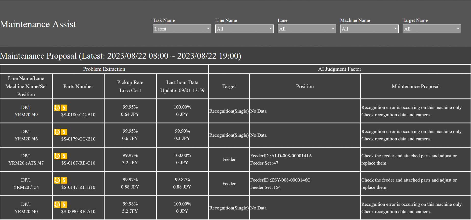 Le logiciel identifie les causes probables des exceptions enregistrées grâce à des méthodes d’analyse telles que l’évaluation des flux ou le diagnostic des codes d’erreur, des données de l’état de santé et de la reconnaissance d’images. Le logiciel analyse automatiquement les erreurs de prise et indique aux équipes de production l’heure, les circonstances et l’emplacement exact de chaque erreur, ainsi que les mesures correctives à apporter. Le nouveau tableau de bord s’intègre harmonieusement au logiciel de fabrication intelligente YSUP de Yamaha qui fournit des outils d’aide à la production : planification, mise en œuvre, mesure et amélioration de la fabrication sur les lignes de production CMS. Parmi ces outils figurent des applications d’ordonnancement de la production, de création des ordres de fabrication, de programmation des équipements de la ligne, de gestion des composants, de suivi du statut de la production, de garantie de la traçabilité, de prédiction des résultats et de vérification des flux de travail.