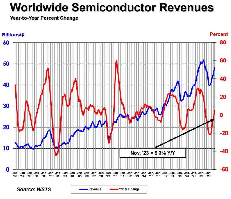 « Les ventes mondiales de semi-conducteurs ont augmenté d’une année sur l’autre en novembre pour la première fois depuis août 2022, ce qui indique que le marché mondial des puces continue de se renforcer à l’aube de la nouvelle année, affirme John Neuffer, président et CEO de la SIA. A l’avenir, le marché mondial des semi-conducteurs devrait connaître une croissance à deux chiffres en 2024. »