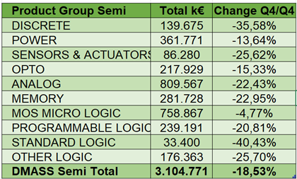 Le quatrième trimestre 2023 a sonné le glas d’une longue période de croissance sur le marché européen de la distribution de composants, d’après l’organisation Dmass Europe. Ses adhérents, constitués de distributeurs et de fabricants, ont déclaré un chiffre d’affaires consolidé de 4,45 milliards d’euros, soit un repli de 17,3% en glissement annuel.