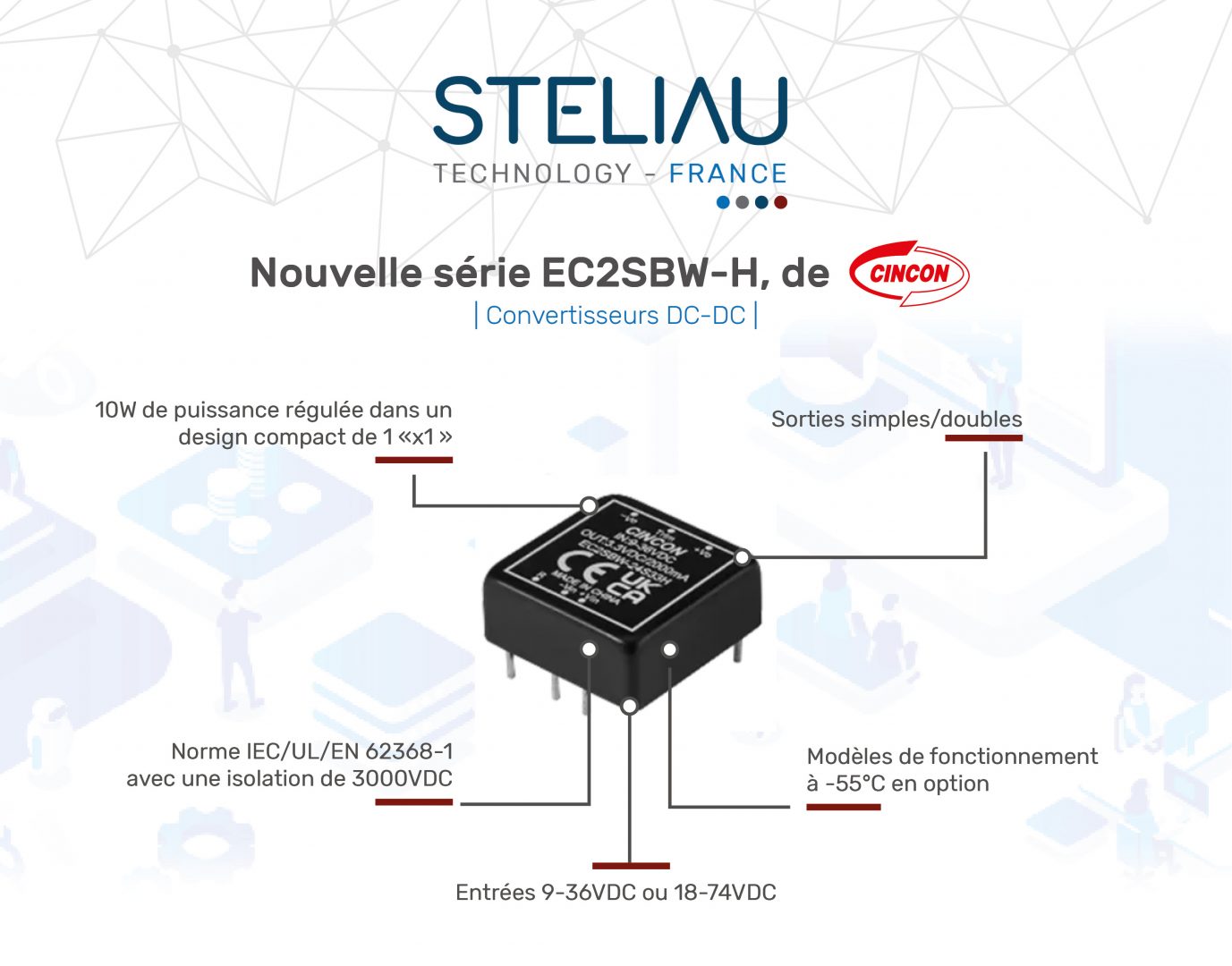 En plus de proposer un rendement élevé et des larges plages de température, cette gamme DC-DC fournit une sortie stable grâce à une régulation de ±0,2% max. pour la régulation de ligne et de ±1,0% max. pour la régulation de charge.