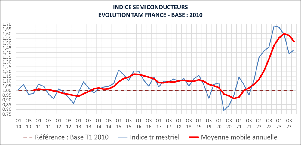 Après deux trimestres en baisse, le marché français des puces reprend de la vigueur. Au 4e trimestre 2023, le total des ventes s’élevait à 615M€, soit une augmentation de 3% en glissement séquentiel, selon Acsiel Alliance Electronique.