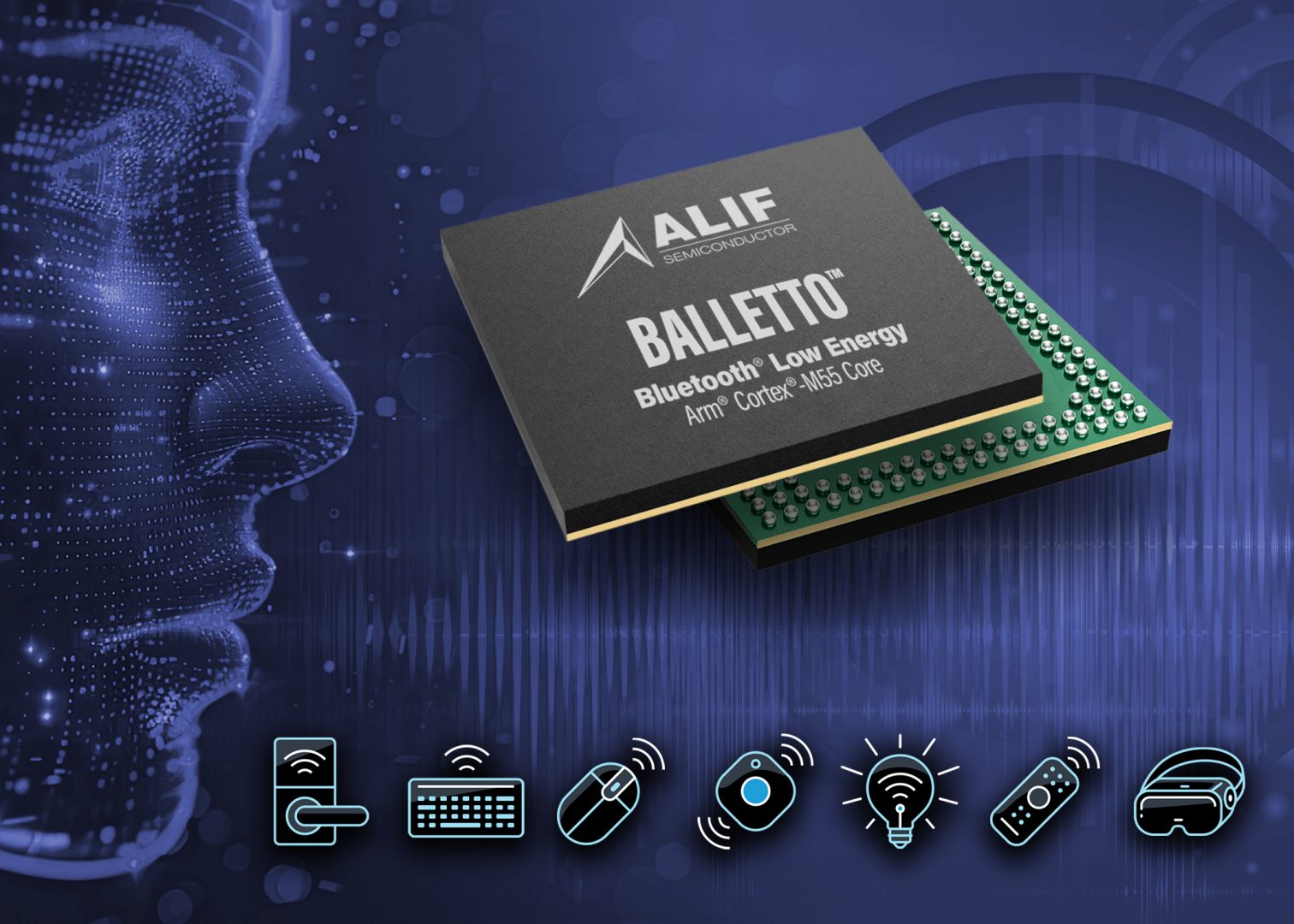 Associer sur un microcontrôleur un frontal RF compatible Bluetooth LE et Matter et un coprocesseur neuronal pour accélérer les algorithmes d’intelligence artificielle ? Telle est l’idée d’Alif Semiconductor avec son circuit Balletto. Epaulé par une large mémoire TCM de 2Mo, le bloc processeur comprend ici un cœur Cortex-M55 à extension DSP Helium, ainsi qu’un accélérateur Ethos-U55 pour l’IA. La technologie d’alimentation sélective aiPM d’Alif permet de réduire la consommation du circuit, qui ne dépasse pas 700nA en mode arrêt.