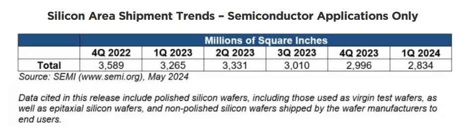 Selon le comité Semi Silicon Manufacturers Group (SMG), les expéditions mondiales de tranches de silicium ont diminué de 5,4% au 1er trimestre 2024 par rapport au 4e trimestre 2023. En comparaison annuelle, elles chutent de 13,2%.