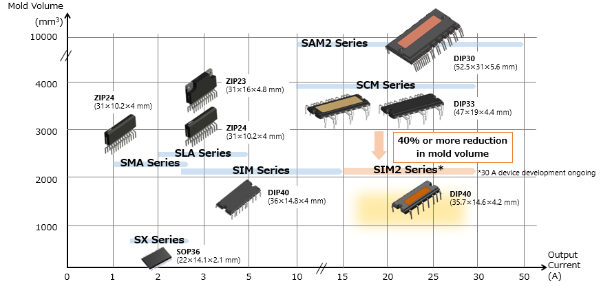Ciblant tout particulièrement les réfrigérateurs et les systèmes d’air conditionné, le dernier pilote de moteur triphasé de Sanken se distingue par sa compacité. Référencé SIM2-151AB, ce circuit 600V/15A tient en effet dans un boîtier DIP40 mesurant 35,7×14,6×4,2mm, annoncé comme 40% plus compact que le traditionnel boîtier DIP33 de 47x19x4,4mm. Le SIM2-151AB y embarque transistors, blocs de commande, et diodes et résistances de bootstrap.