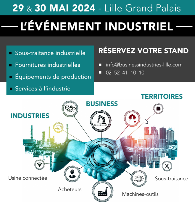 Lille Grand Palais (Hall Paris) abritera du mercredi 29 mai au 30 mai prochain Business Industries Lille, qui combine, comme son nom l’indique, « un salon industriel et des rendez-vous d’affaires organisés ».