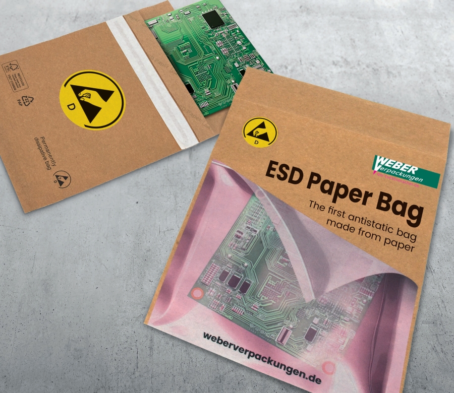 Les sachets protégeant les composants et cartes électroniques des décharges électrostatiques (ESD) sont communément faits de plastique, donc polluants. Cela n’est pas une fatalité pour l’Allemand Weber Verpackungen, qui présente aujourd’hui ce qu’il considère être le premier sachet anti-ESD en papier recyclé de l’industrie. Conforme à la norme DIN EN 61340-5-3, ce sachet présenterait selon l’Allemand une meilleure résistance volumique que les équivalents en plastique, tout en étant durable et peu sensible à l’humidité. Il est disponible en sept tailles différentes allant de 9x12cm à 42x50cm, avec bien sûr la possibilité d’en personnaliser les dimensions et le marquage.