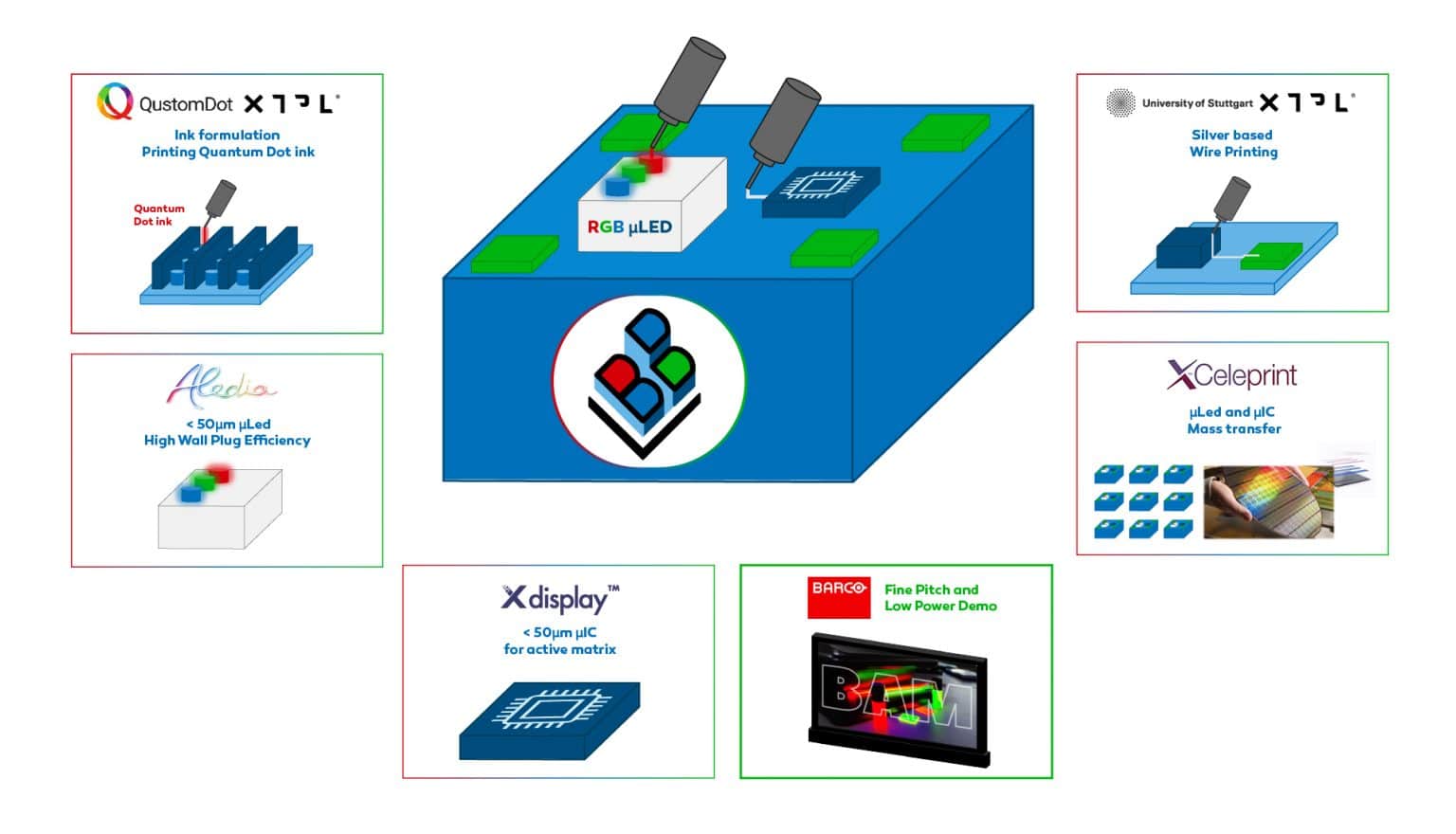 BAMBAM réunit l’Institut USTUTT de Stuttgart, spécialisé dans la production microélectronique sur de larges surfaces, cinq entreprises (Aledia, les Irlandais XDisplay et X-Celeprint, le Belge QustomDot et le Polonais XTPL ) et le Belge Barco chargé de définir les contraintes du marché. Le projet vise à supprimer la couche TFT des écrans larges, particulièrement énergivore et dont l’Europe n’a pas le savoir-faire, en mettant en œuvre un process basé sur des pixels à microLed actives (donc intégrant leurs propres blocs de commande, d’où l’élimination du panneau TFT) et l’impression des structures optiques et électriques.