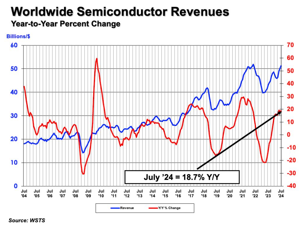 Les ventes mensuelles de l’industrie mondiale des puces continuent leur ascension au mois de juillet pour atteindre 51,32Md$, soit une augmentation de 18,7% par rapport à juillet 2023 et de 2,7% en glissement séquentiel.