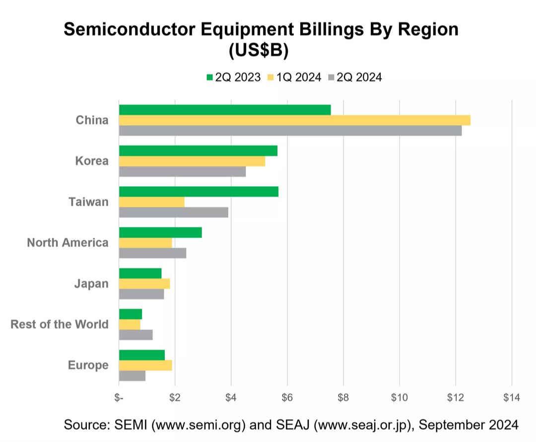 Au 2e trimestre 2024, la Chine est, une nouvelle fois, arrivée en tête des achats d’équipements de fabrication de puces avec 12,21Md$. Elle est suivie (de loin) par la Corée du Sud et Taïwan avec respectivement 4,52Md$ et 3,9Md$. Au total, les ventes mondiales d’équipements pour composants se sont élevées à 26,78Md$ au 2e trimestre, ce qui représente une augmentation de 1% en glissement séquentiel et de 4% en glissement annuel.