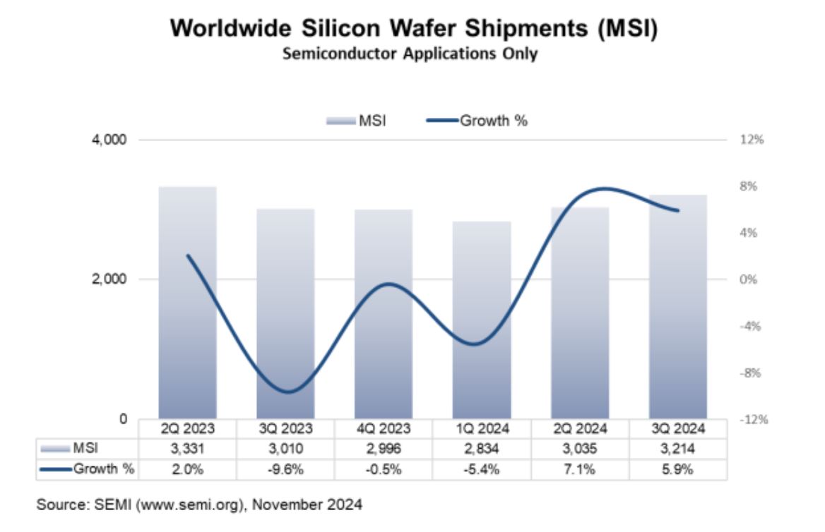 Selon l’organisation Semi Silicon Manufacturers Group (SMG), les expéditions mondiales de tranches en silicium ont augmenté de 5,9% au 3e trimestre 2024, en variation séquentielle. Elles ont également progressé de 6,8% par rapport au 3e trimestre 2023.