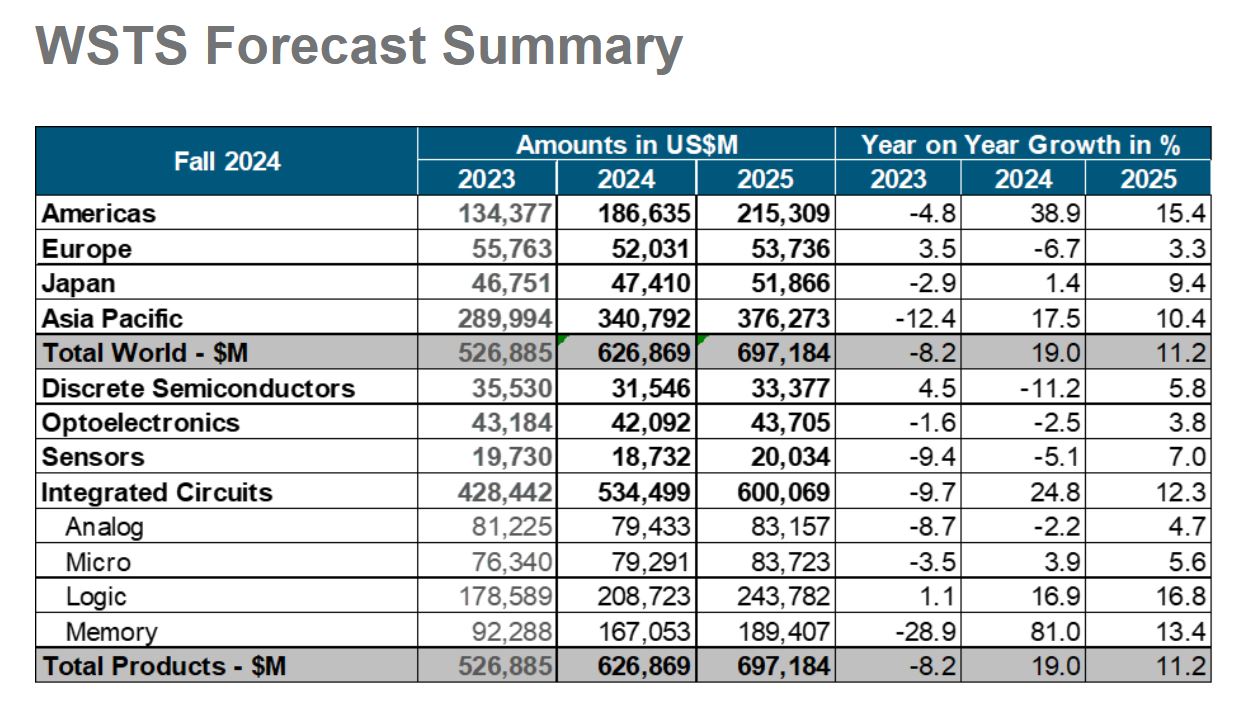 Le WSTS (World Semiconductor Trade Statistics) a revu à la hausse ses prévisions pour l’ensemble de l’année 2024. L’organisme table désormais sur une croissance de 19% d’une année sur l’autre pour un marché estimé à pratiquement 627Md$.