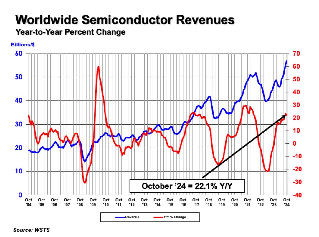 « Le marché mondial des semi-conducteurs termine l’année 2024 sur une note positive, car l’industrie a atteint son plus haut niveau de ventes mensuelles en octobre et les ventes d’un mois sur l’autre ont augmenté pour le septième mois consécutif », a déclaré John Neuffer, président et CEO de la SIA.
