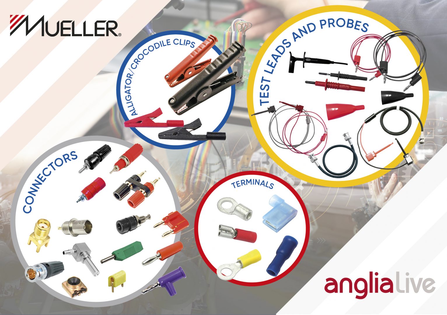 L’Américain Mueller Electric s’adresse principalement aux ingénieurs de laboratoire et aux fabricants d’équipements de test et de mesure. Au rang de ses produits, figurent des cordons de test et des sondes, des pinces crocodile/alligator, des connecteurs et des bornes de test. A cette occasion, John Bowman, le  directeur marketing chez Anglia rappelle [que] « beaucoup de gens ne savent peut-être pas que Mueller a inventé la pince crocodile. Aujourd’hui, il est l’un des principaux fabricants d’assemblages de câbles et de connecteurs. Nous avons maintenant doublé la gamme de produits que nous proposons de ce fabricant leader de clips électriques, de cordons de test, de clips de télécommunications, d’assemblages de câbles et d’isolants de haute qualité, robustes, durables et d’un excellent rapport qualité-prix ».