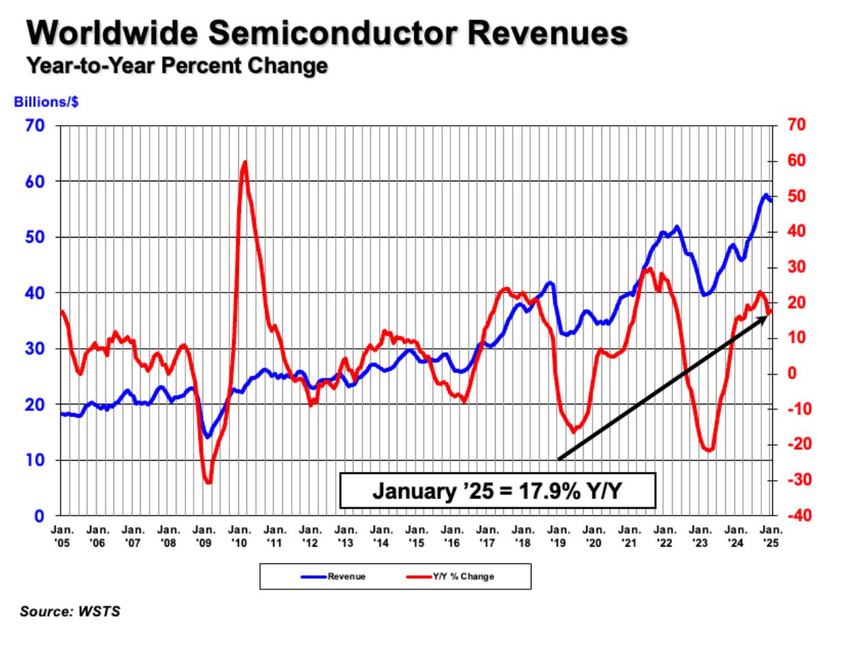 Selon le WSTS (World Semiconductor Trade Statistics), les ventes du marché mondial des puces se sont élevées à 56,5Md$ au cours du mois de janvier. Ceci représente une augmentation de 17,9% par rapport à janvier 2024, mais une baisse de 1,7% par rapport au mois de décembre 2024.