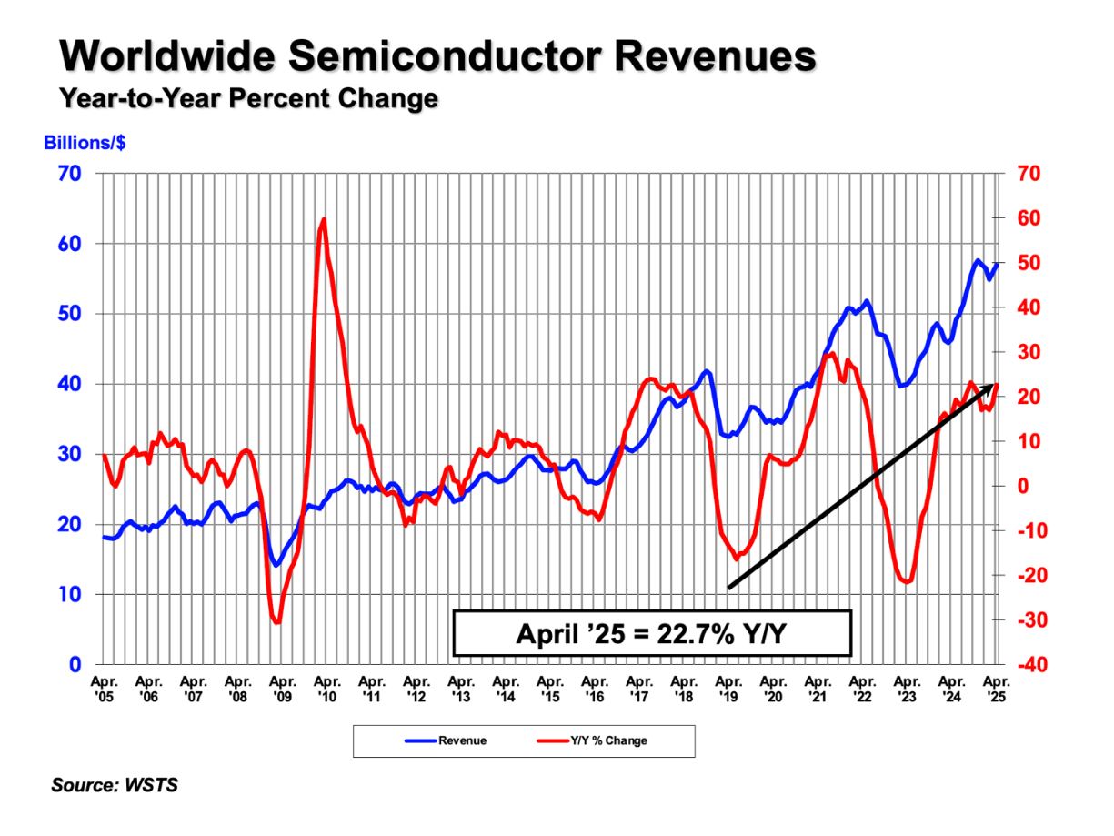 « En avril, les ventes mondiales de semi-conducteurs ont progressé d’un mois sur l’autre pour la première fois en 2025, et le marché mondial continue d’enregistrer une croissance annuelle soutenue par la hausse des ventes en Amérique et en Asie-Pacifique, a déclaré John Neuffer, président et CEO de la SIA. Parallèlement, les nouvelles prévisions sectorielles du WSTS tablent sur une solide croissance du marché mondial en 2025, portée par la demande en IA, en infrastructures cloud et en électronique grand public de pointe. »