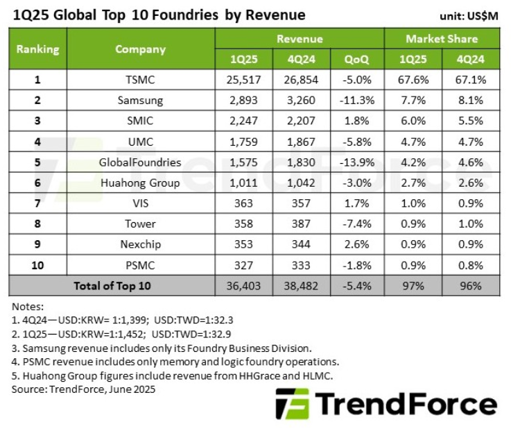 Selon le dernier rapport du cabinet d’études TrendForce, l’industrie mondiale de la fonderie a enregistré un chiffre d’affaires de 36,4Md$ lors du 1er trimestre 2025, en recul de 5,4% en variation séquentielle.
