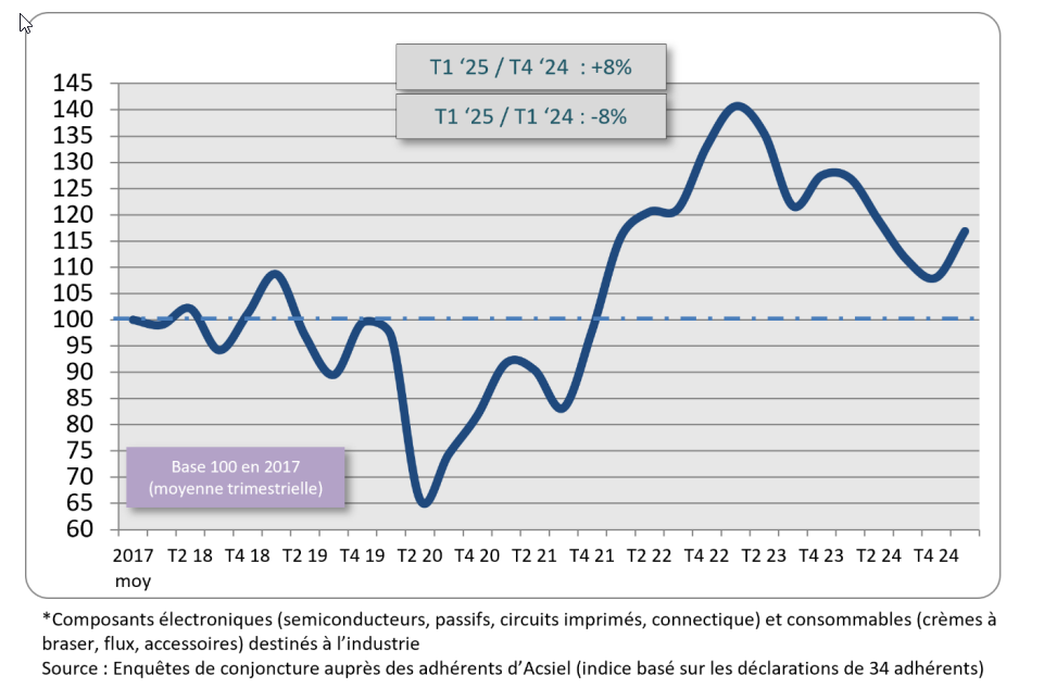 Acsiel (Alliance des composants et systèmes pour l’industrie électronique) a délivré son baromètre des ventes trimestrielles de la filière électronique nationale. Ce baromètre intègre deux indicateurs : d’une part les ventes liées aux composants électroniques (semi-conducteurs, passifs, PCB, connectique) et aux consommables (crèmes à braser, flux, accessoires) pour l’industrie, d’autre part les ventes liées aux équipements de test et de mesure et de production de cartes électroniques.