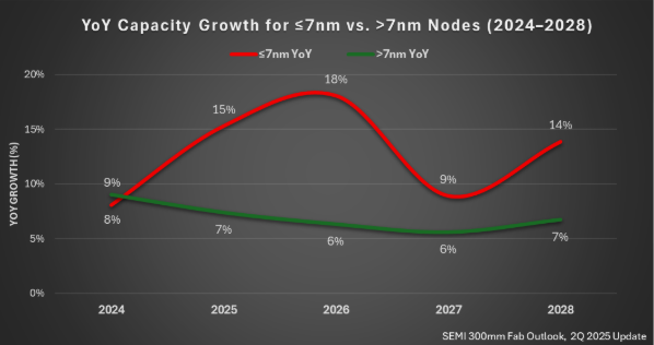 Selon le rapport 300mm Fab Outlook de l’association Semi, la capacité de production de composants avancés (7nm et moins) devrait passer de 850 000 tranches par mois en 2024 à 1,4 million de tranches par mois en 2028, soit une augmentation de 69% !