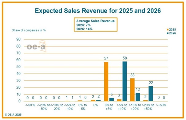 « Nous observons un bilan mitigé, mais globalement stable et positif », résume le Dr Klaus Hecker, directeur général de l’OE-A. Pourtant, la tendance semble plutôt lorgner vers le bas : 60% des entreprises anticipent une croissance du secteur en 2025, alors qu’elles étaient 77% lors de l’enquête précédente réalisée en février. Le secteur prévoit également une progression des ventes de 7% en 2025 contre 9% en février, tandis que les projections de prises de commandes sont inférieures à celles de l’enquête précédente.