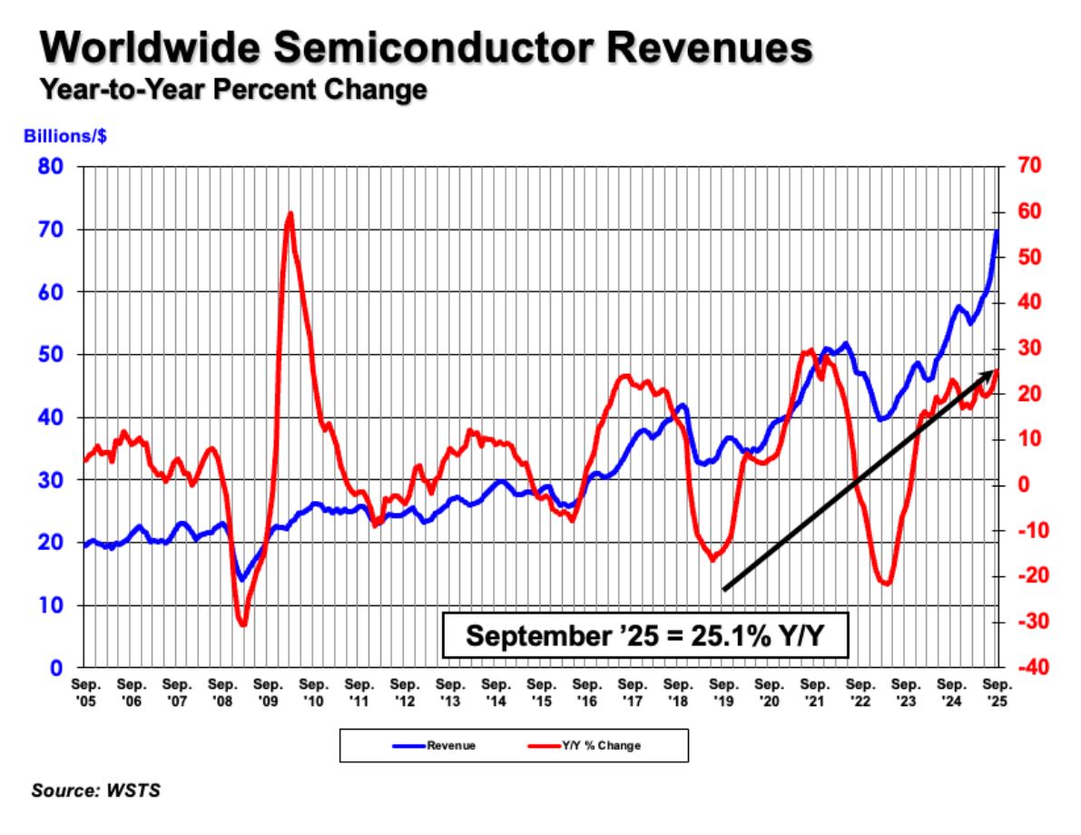 L’industrie mondiale des semi-conducteurs a totalisé un revenu de 69,47Md$ en septembre, frôlant ainsi la barre des 70Md$ qui sera sans doute franchie au mois d’octobre.